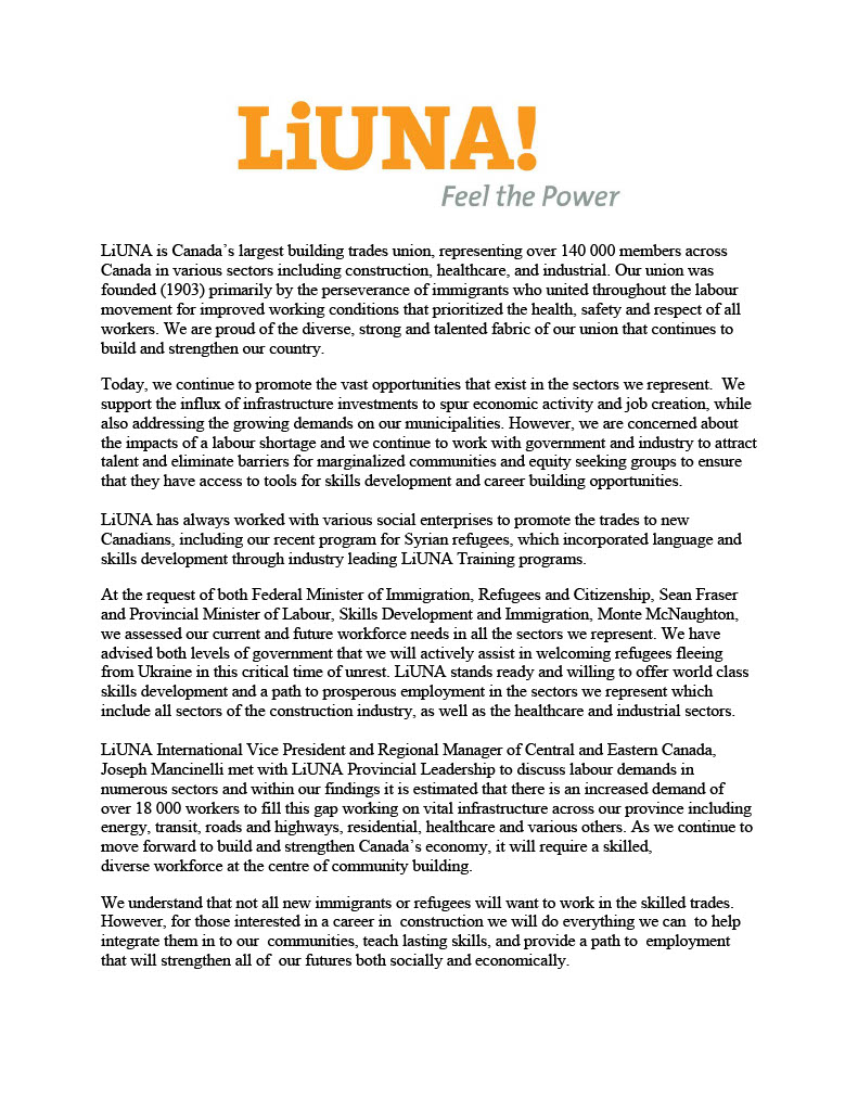 LiUNA united to welcome refugees from Ukraine in Ontario