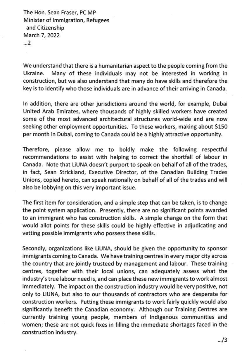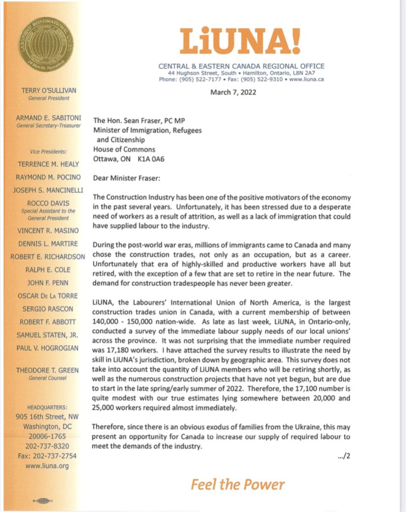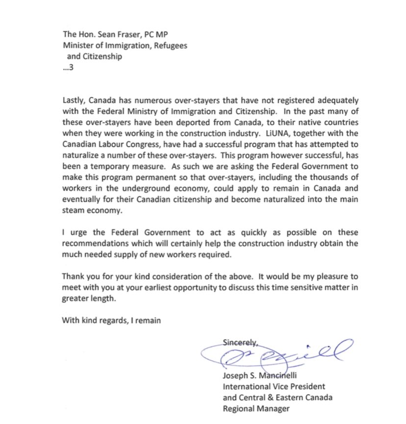 Letter on behalf of LiUNA International Vice President and Regional Manager of Central and Eastern Canada- Joseph Mancinelli- to Canada Minister of Immigration- Sean Fraser working together with industry and government to attract talent, empower opportunity and address growing labour demands to strengthen our communities, our country and economy